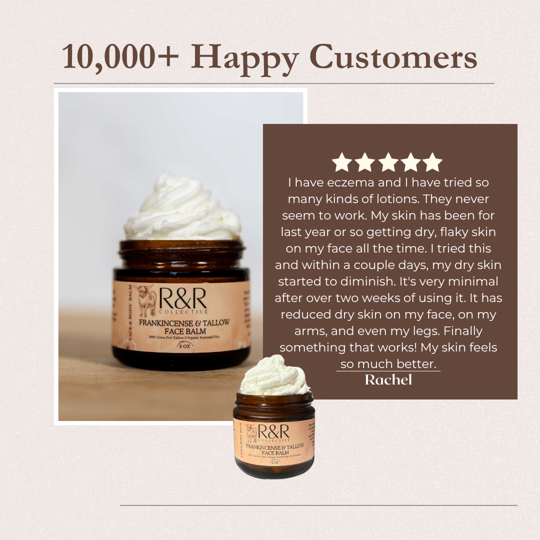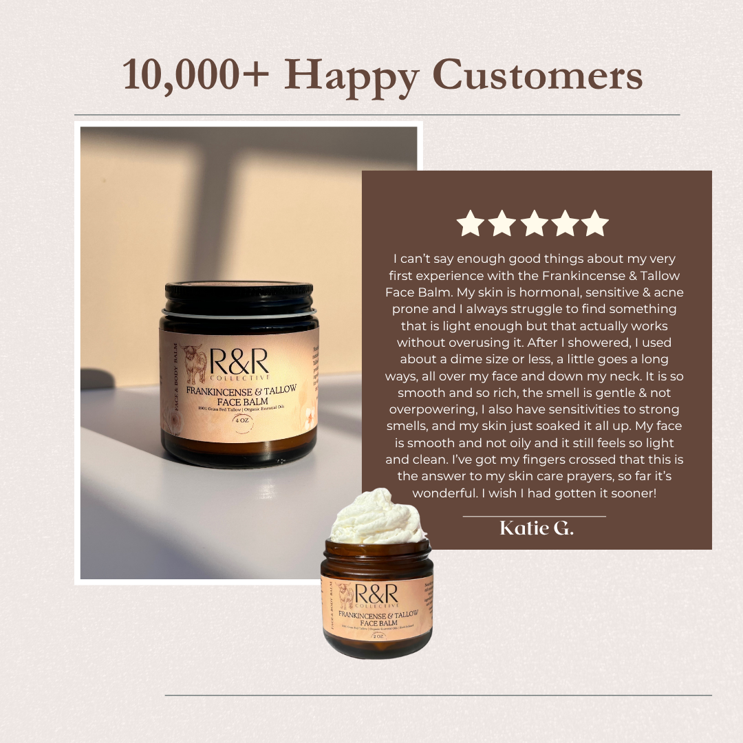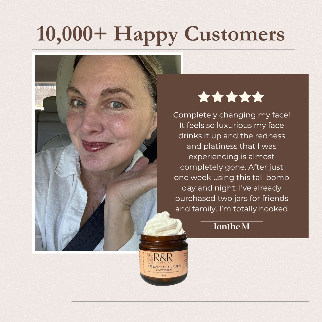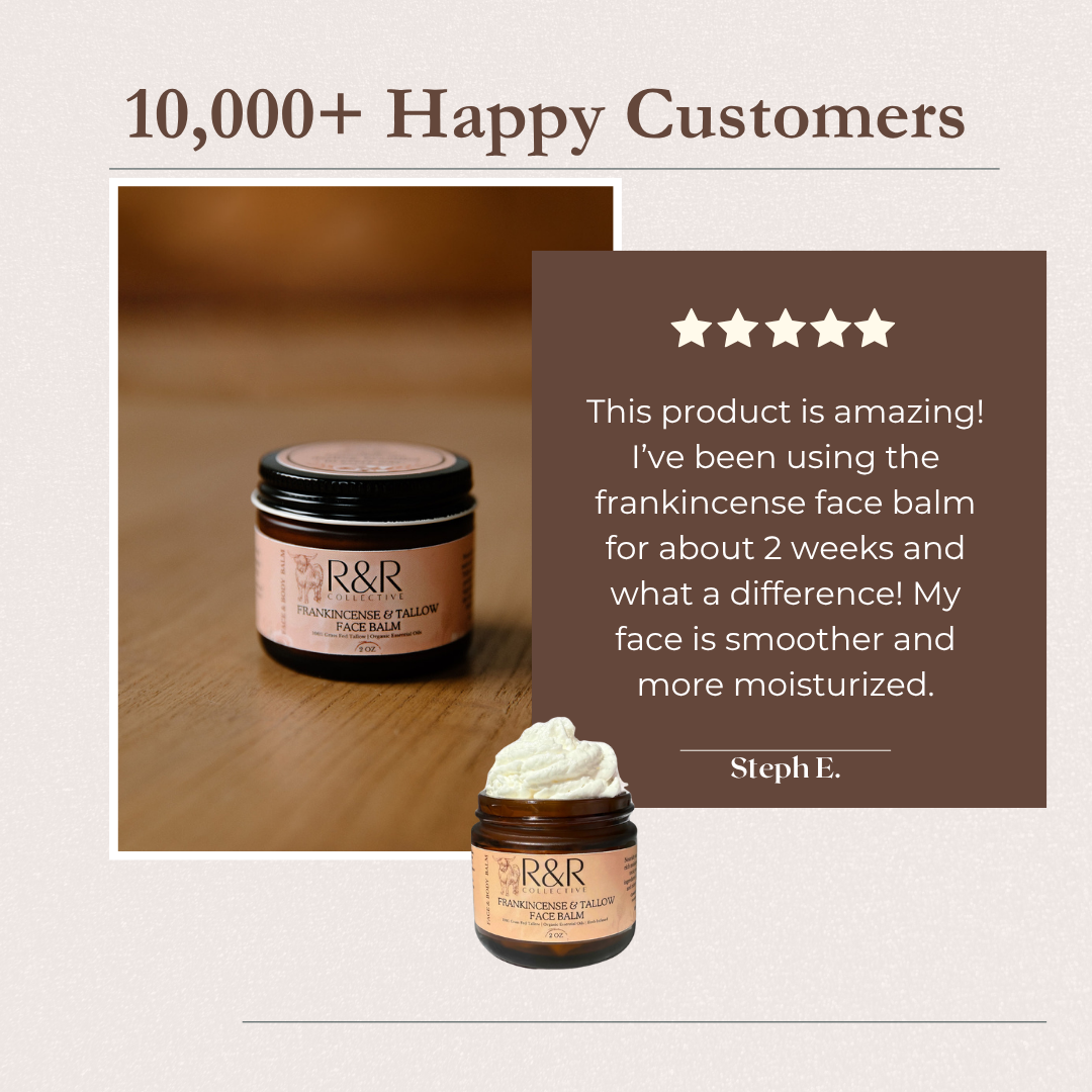 Restore your skin’s natural glow with our Frankincense Face Tallow Balm—a luxurious, deeply nourishing formula designed to hydrate, repair, and revitalize. Handcrafted in small batches with 100% grass-fed suet tallow, squalane oil, and organic jojoba oil infused with calming chamomile and calendula herbs, this balm delivers powerful moisture while supporting skin renewal and balance.