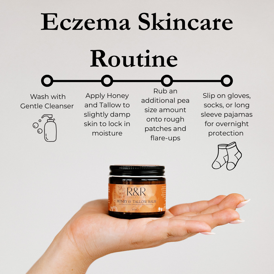 Our Honey & Tallow Balm is a gentle yet powerful option for soothing eczema. Grass-fed tallow nourishes deeply, mimicking the skin’s natural oils to restore balance, while raw honey calms irritation with its natural anti-inflammatory and antimicrobial properties. Together, they hydrate dry, itchy patches and help create a protective barrier that supports healing—without steroids, toxins, or fillers